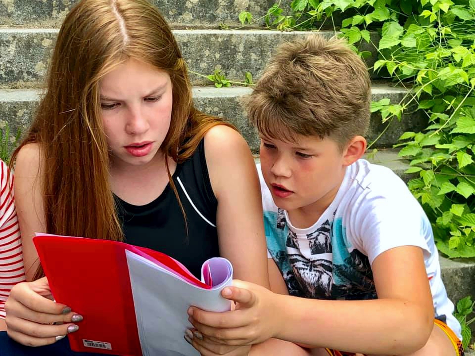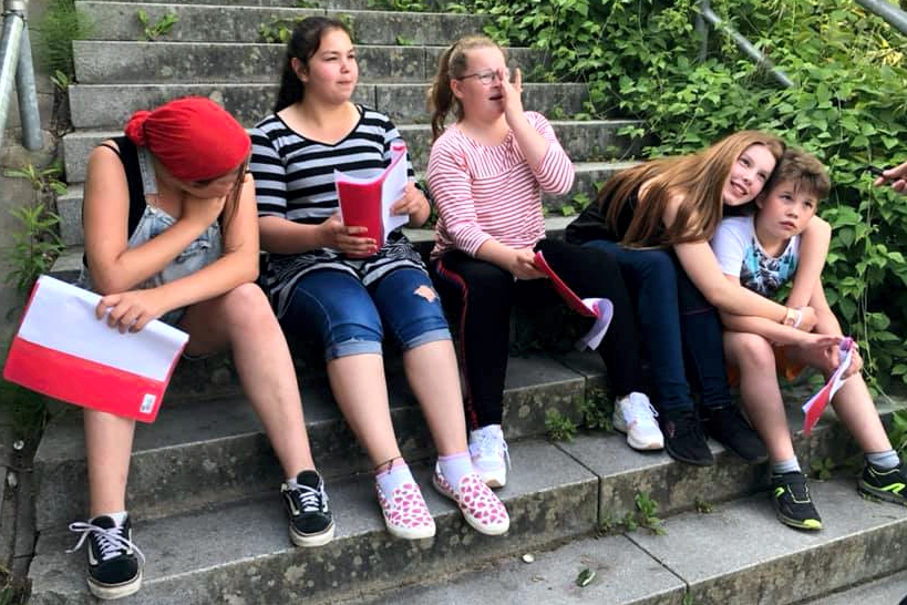 Das Multimedia Kernteam mit dem „Neuen“ beim Drehbuch lesen mit verschiedenen Rollen. Lisa, Elisa, Fiona, Lilli, Julien, Bernd.