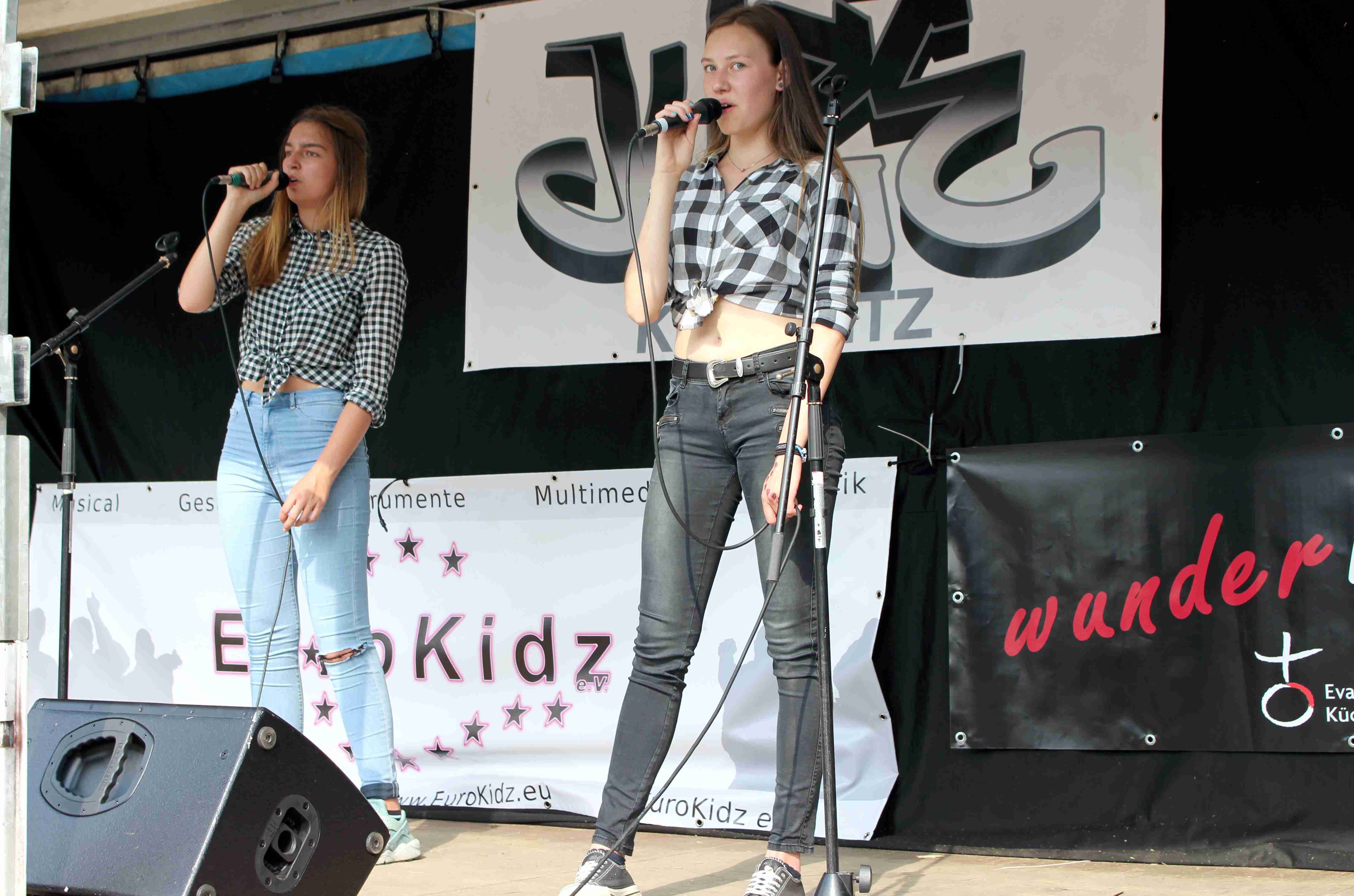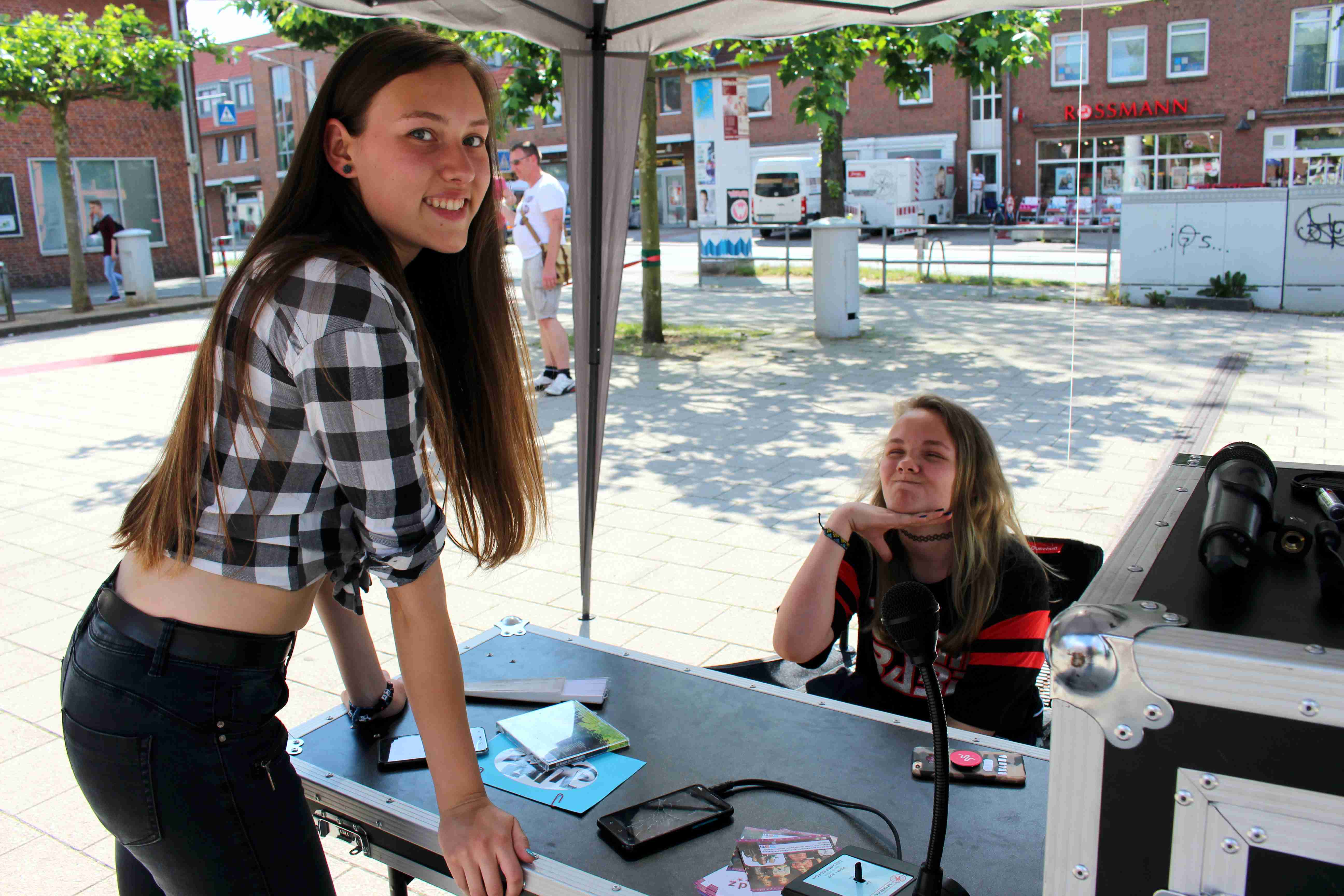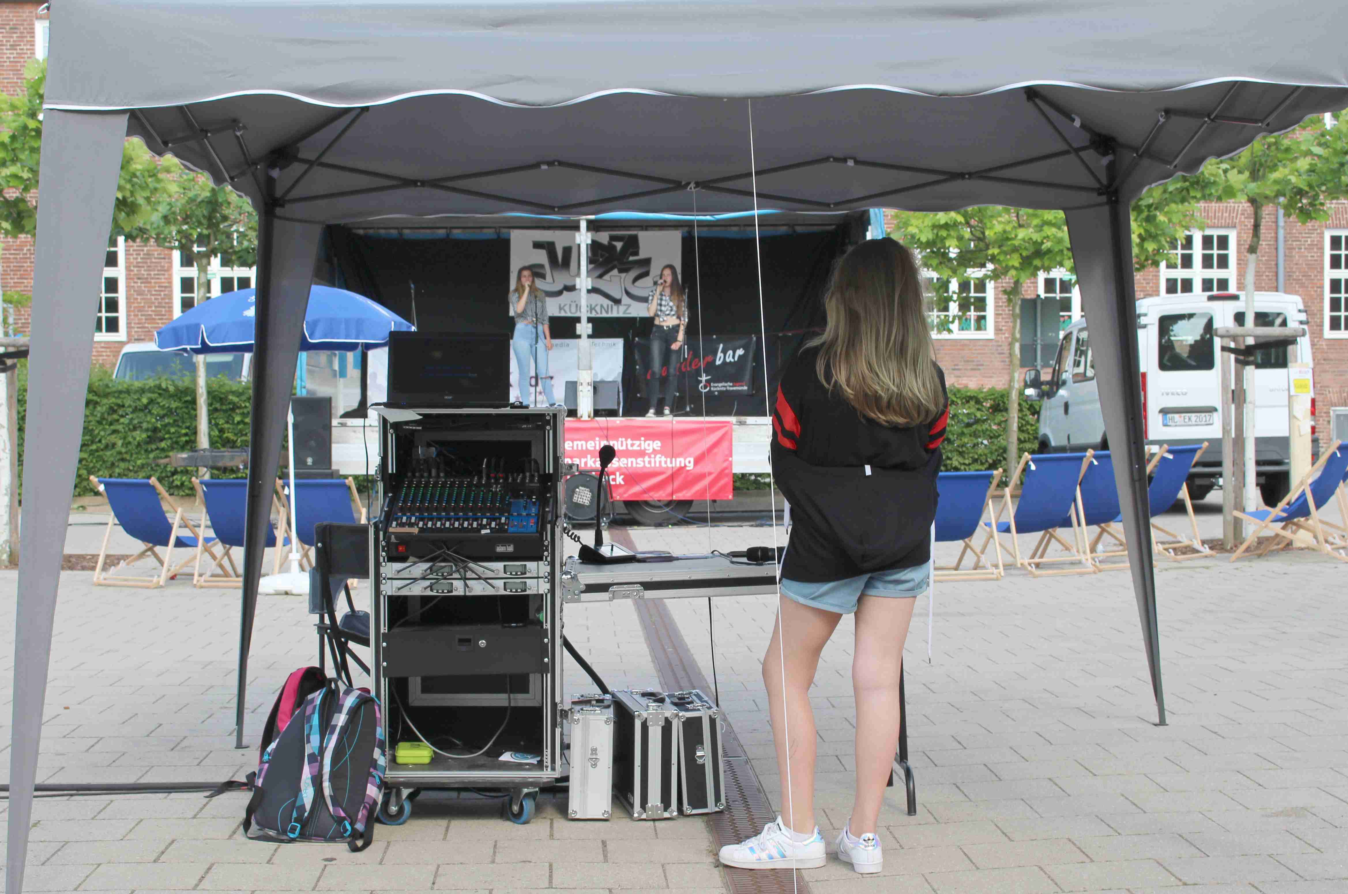 Soundcheck auf dem Kirchplatz in Kücknitz. Karo und Pätty auf der Bühne, überwacht von Celina, die extra aus Hamburg angereist ist um dabei zu sein.