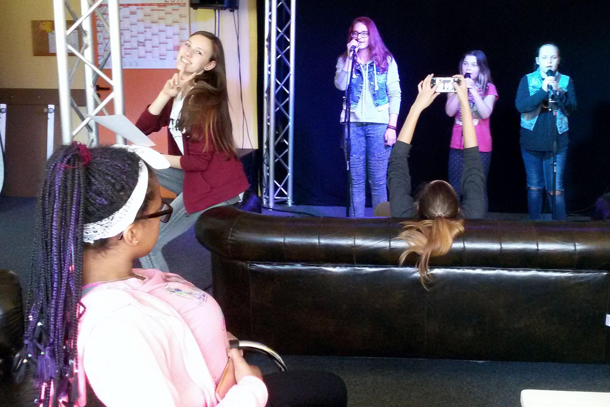 Du kannst in unserem Tonstudio mit Mikrofonen und großer Gesangsanlage den Klang Deiner Stimme ausprobieren oder Deinen Gesangsstil und Sound verbessern. Zum Workshopende, kannst Du einen Song als mp3 aufnehmen und mitnehmen.