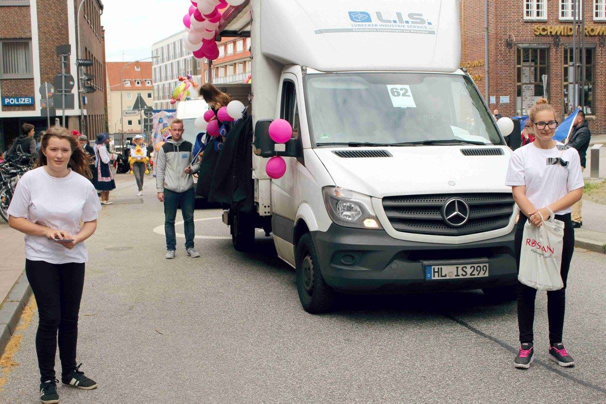 Tanzgruppe und Animateure, Kiara und Scarlet, vor unserem Umzugswagen. Sie haben mit sehr gewagten Körperbewegungen die Leute begeistert.