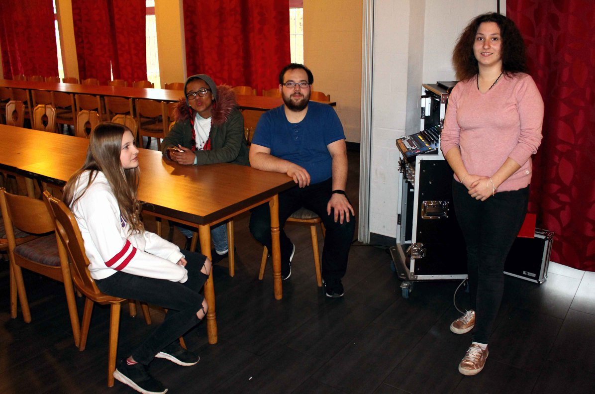 Technikecke mit wartenden Sängerinnen. Leonie, Elaisah, Tim, Nikoleta.