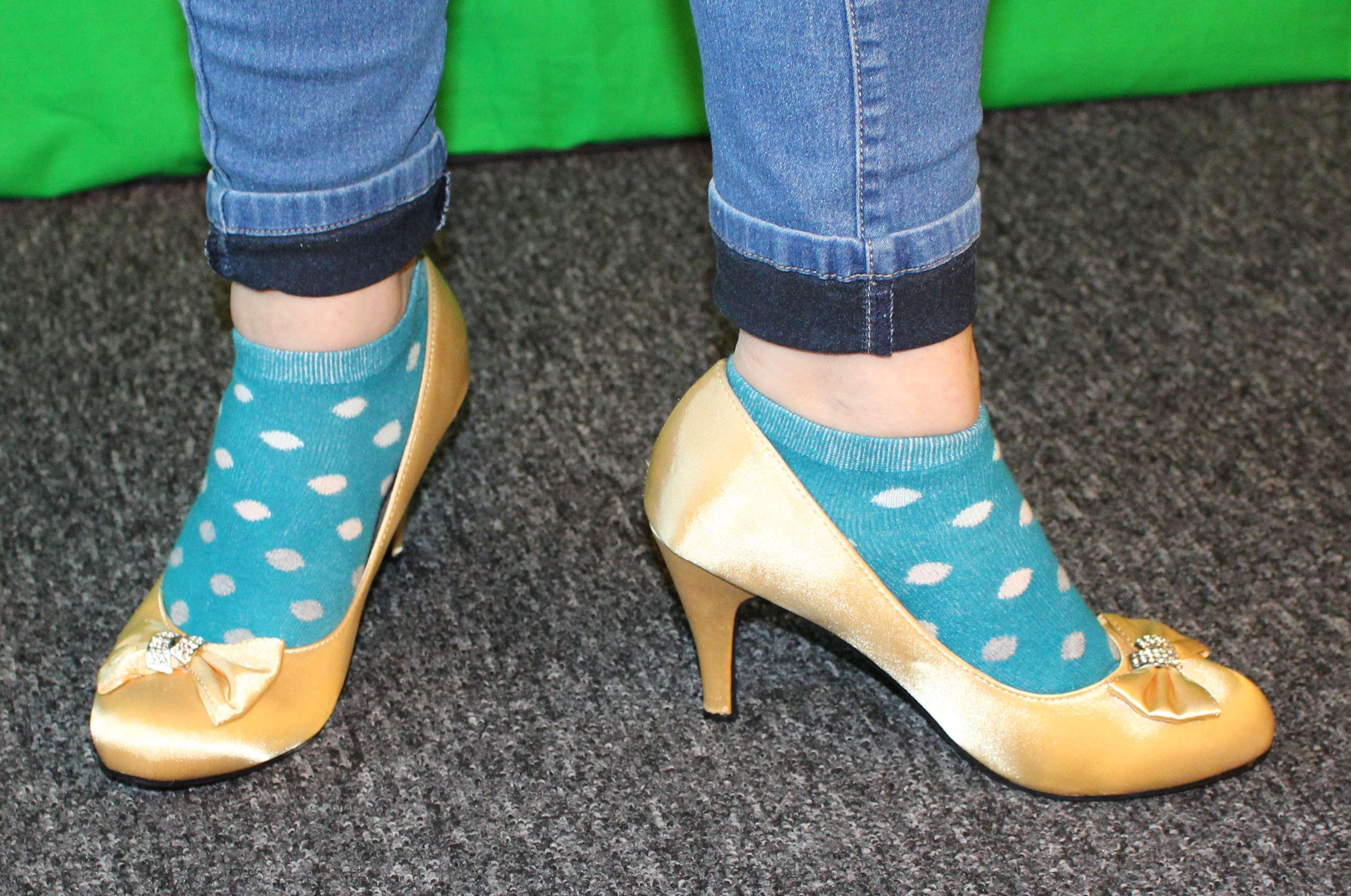 Jeans, Wollsocken und echte Seiden-Pumps mit dicken Diamanten.