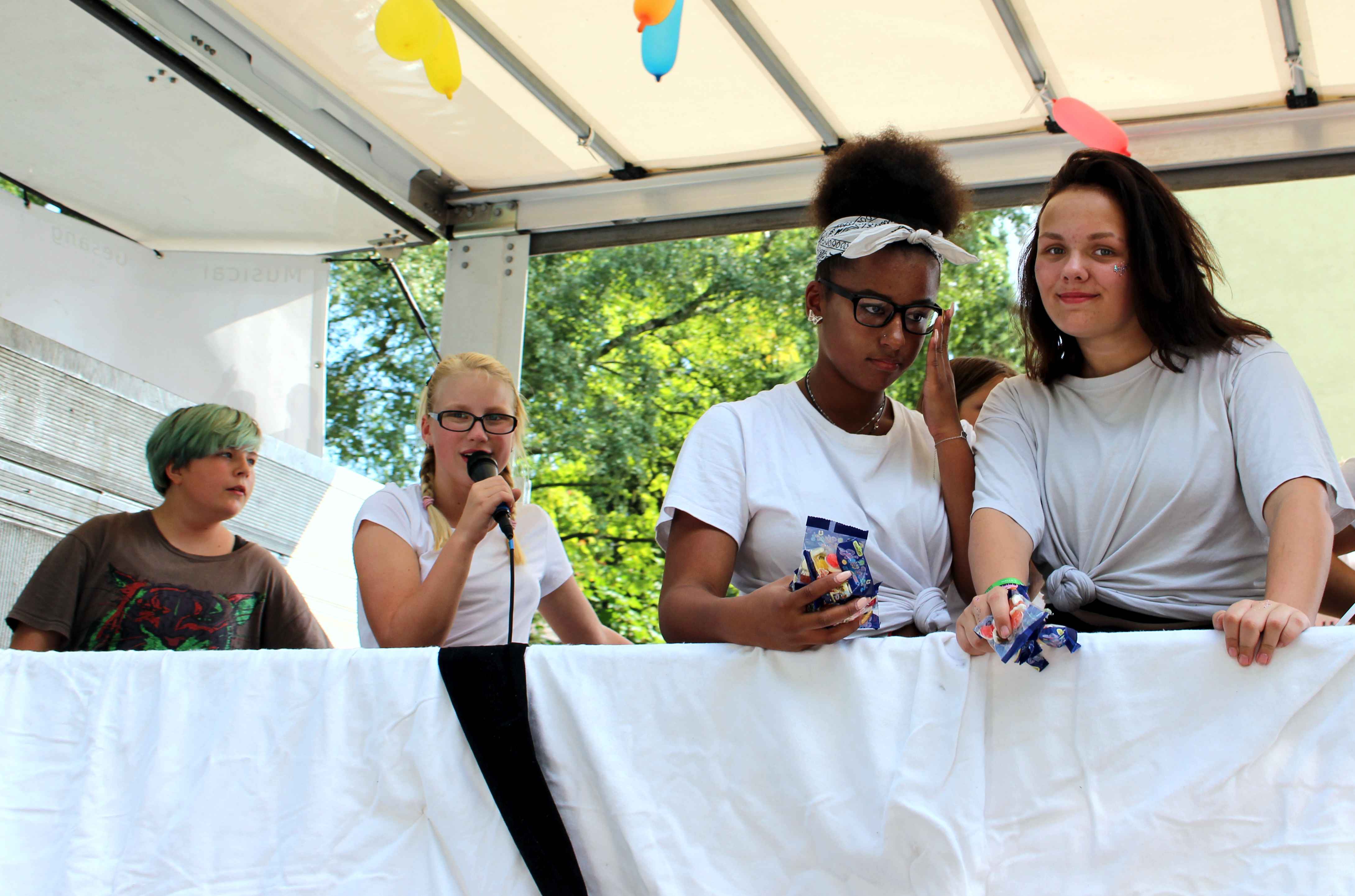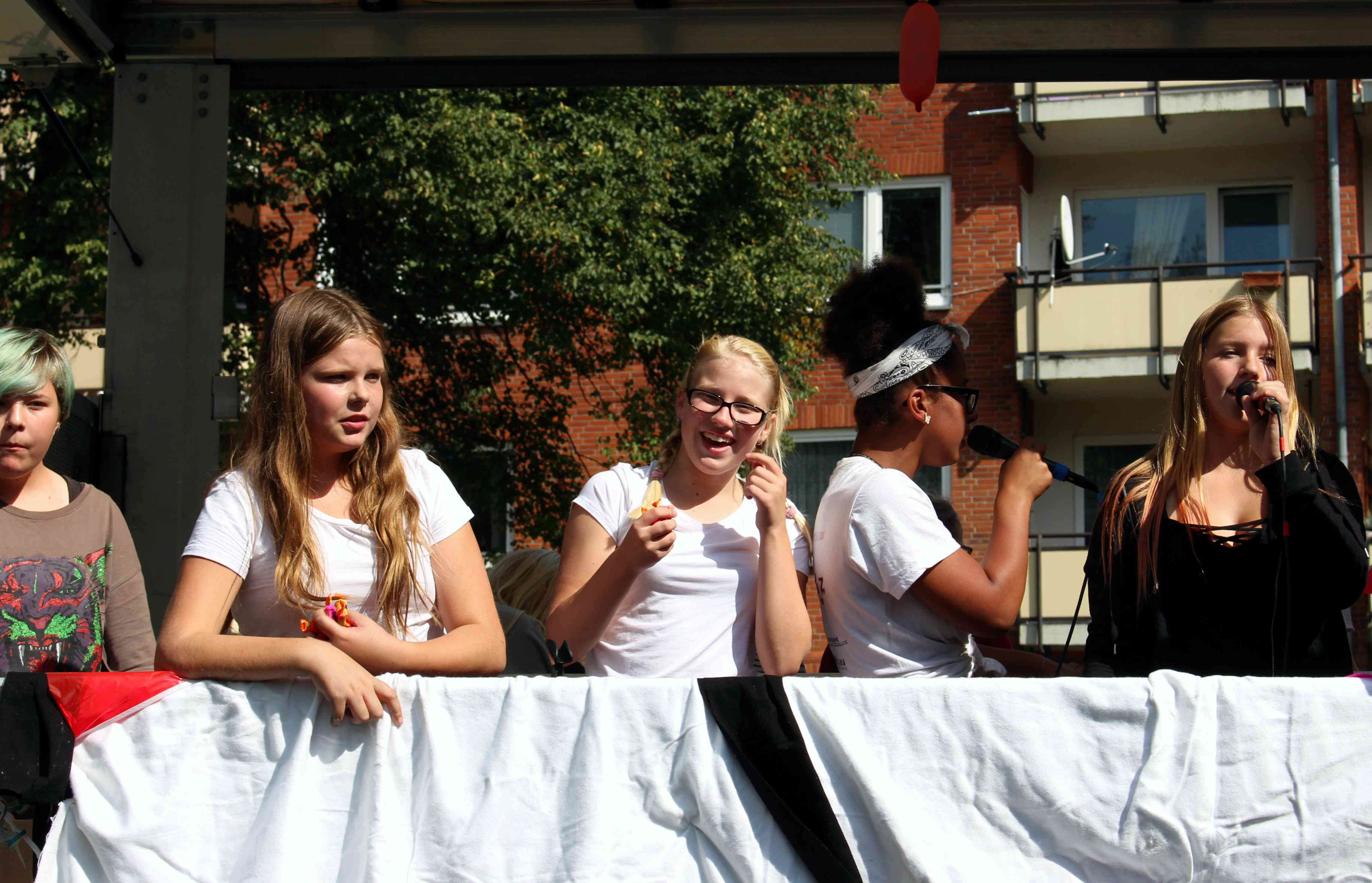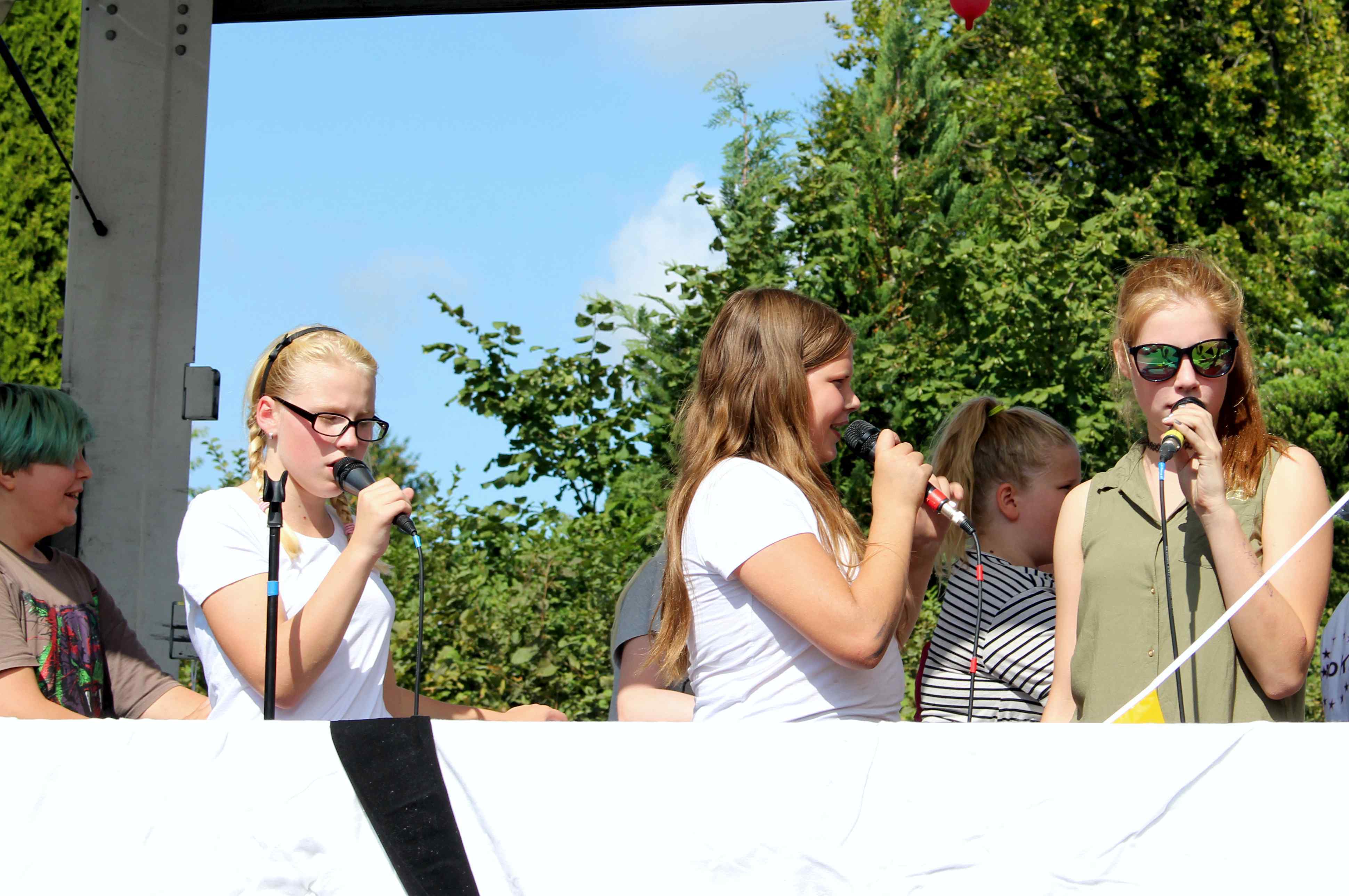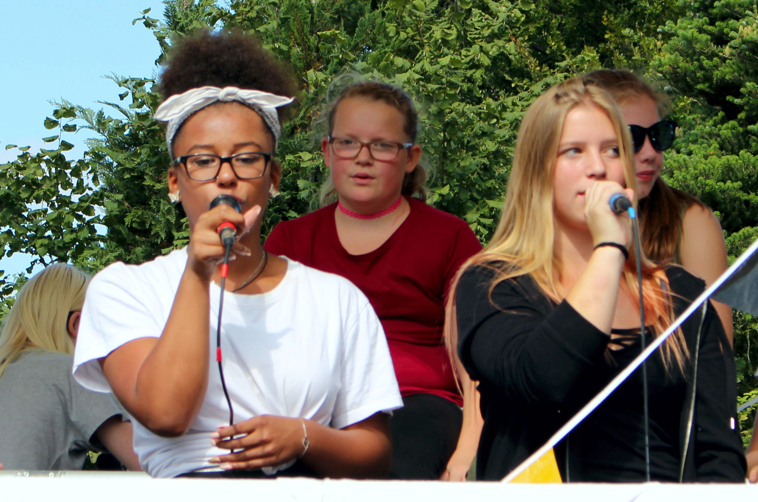 Die Band unter 13 singt unbeirrt auf dem schwankenden LKW. Luci, Finja, Liesa, Anna, Liilie.