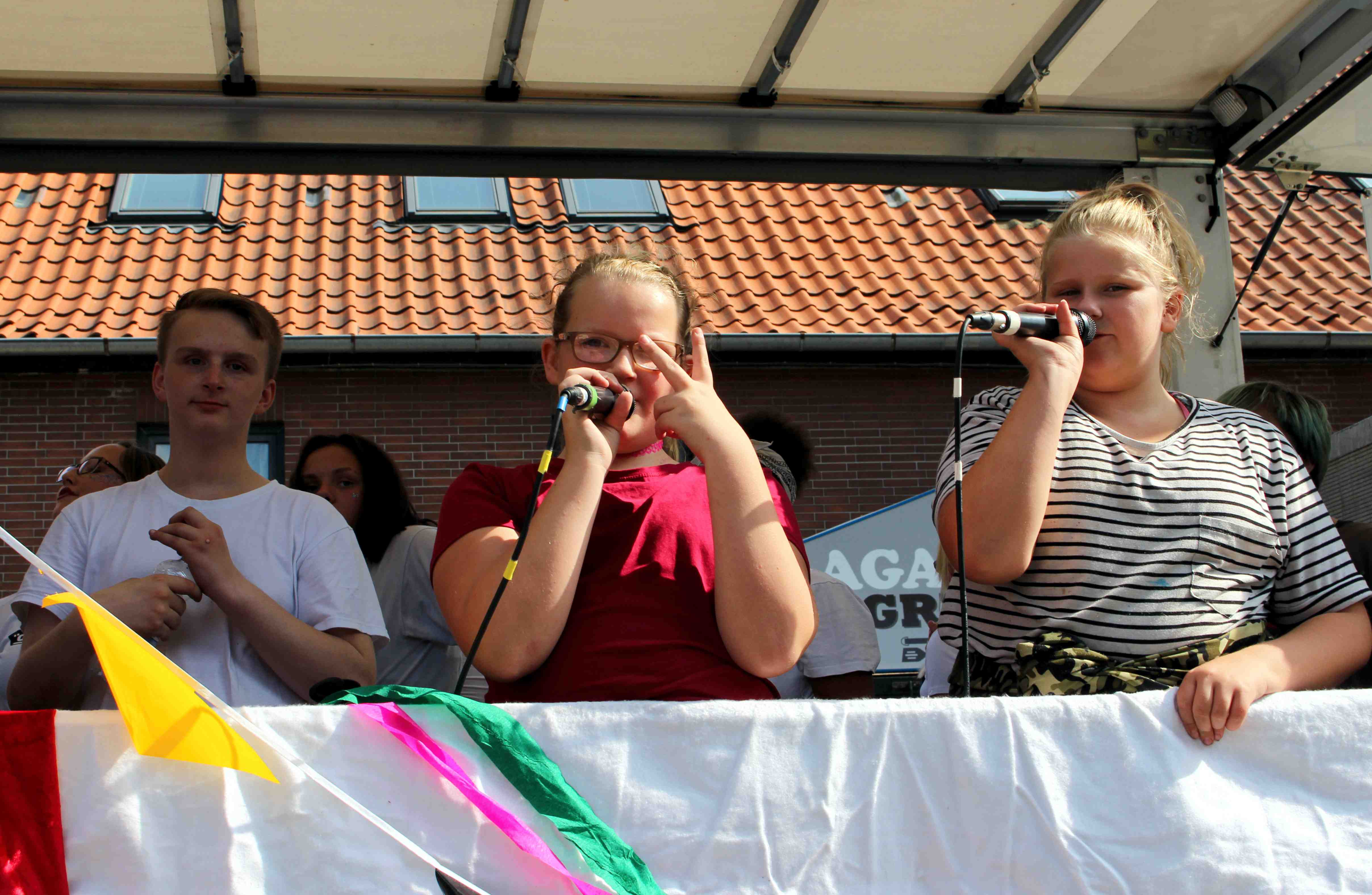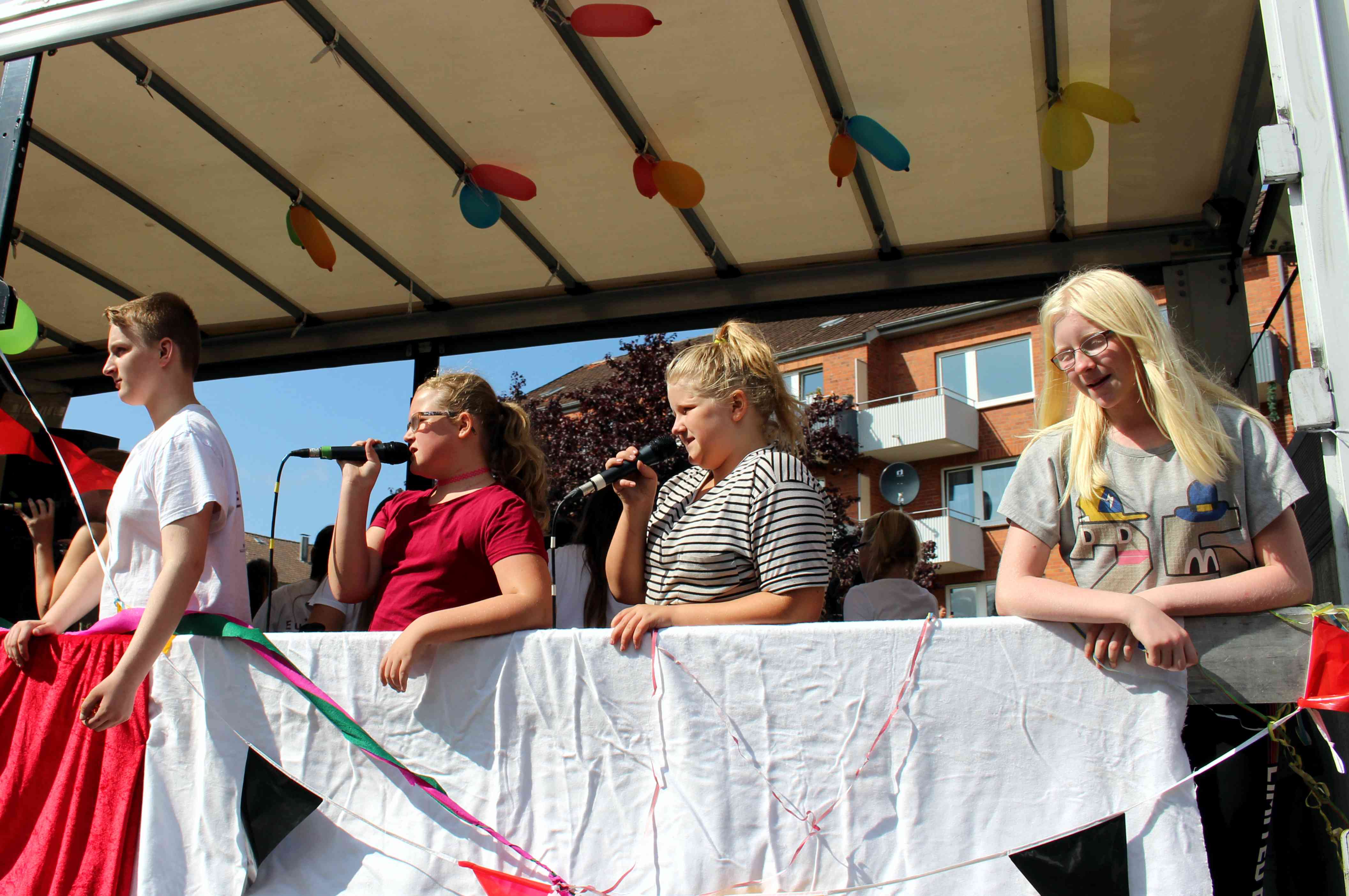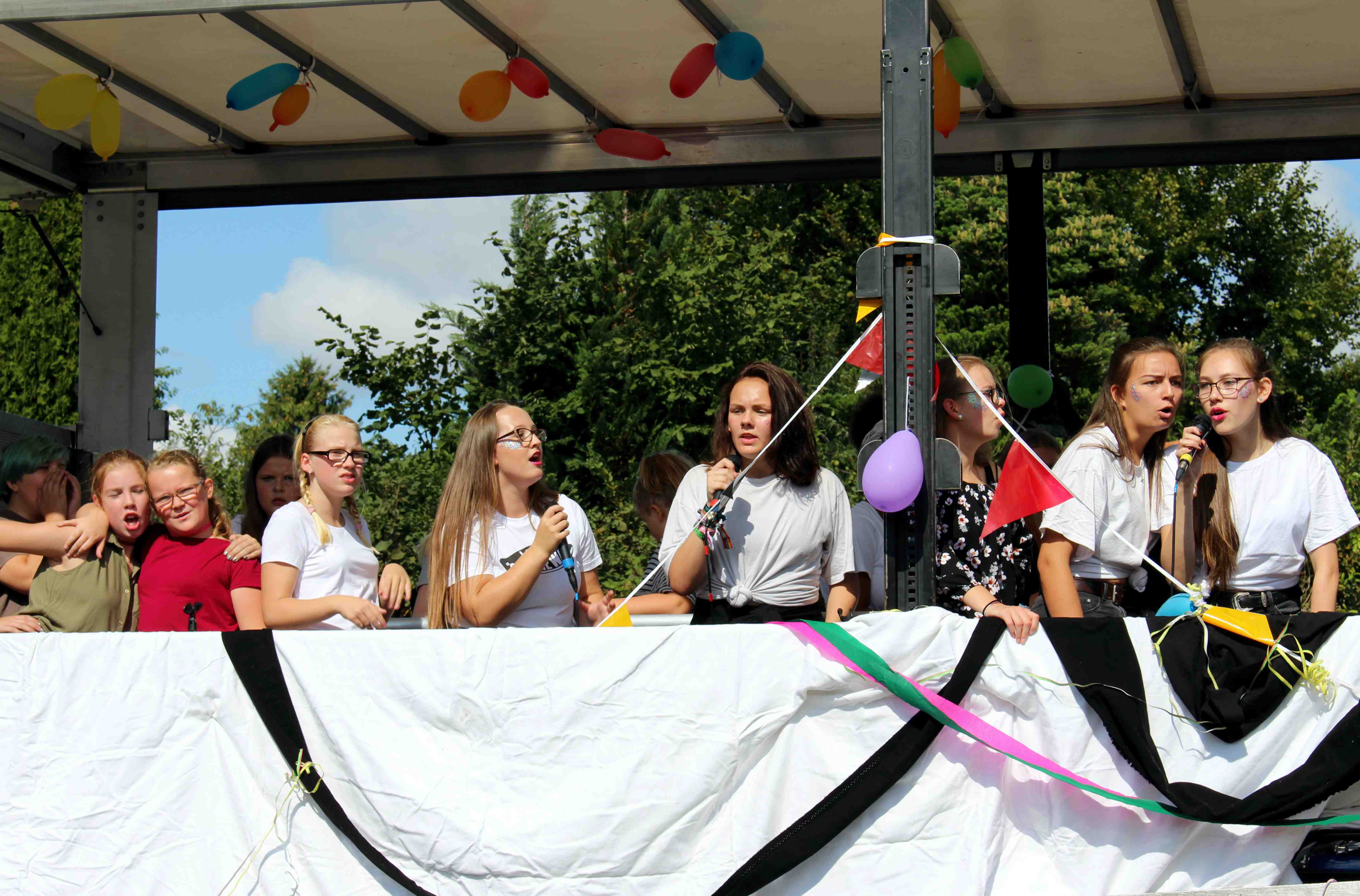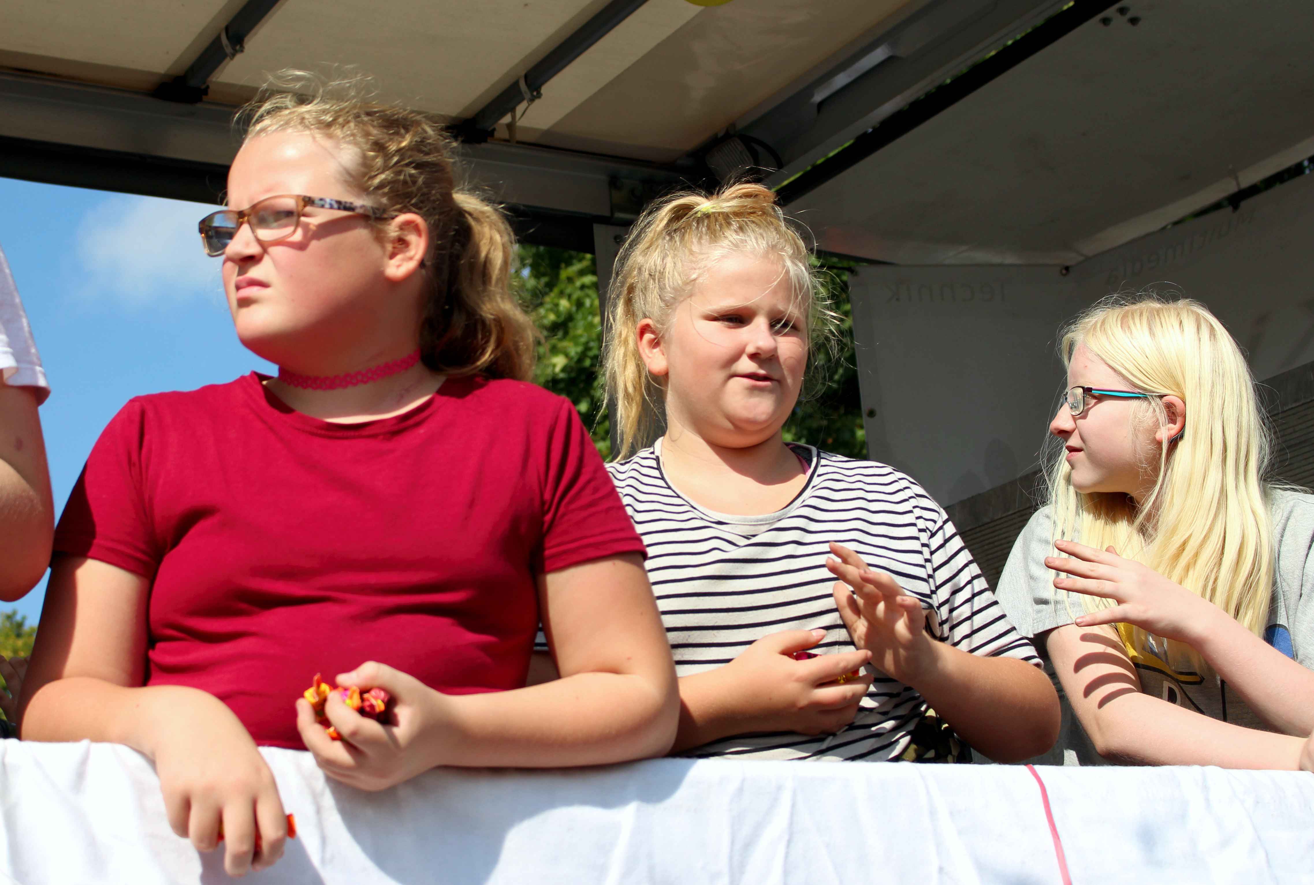 Die Band unter 13 singt unbeirrt auf dem schwankenden LKW. Luci, Finja, Liesa, Anna, Liilie.