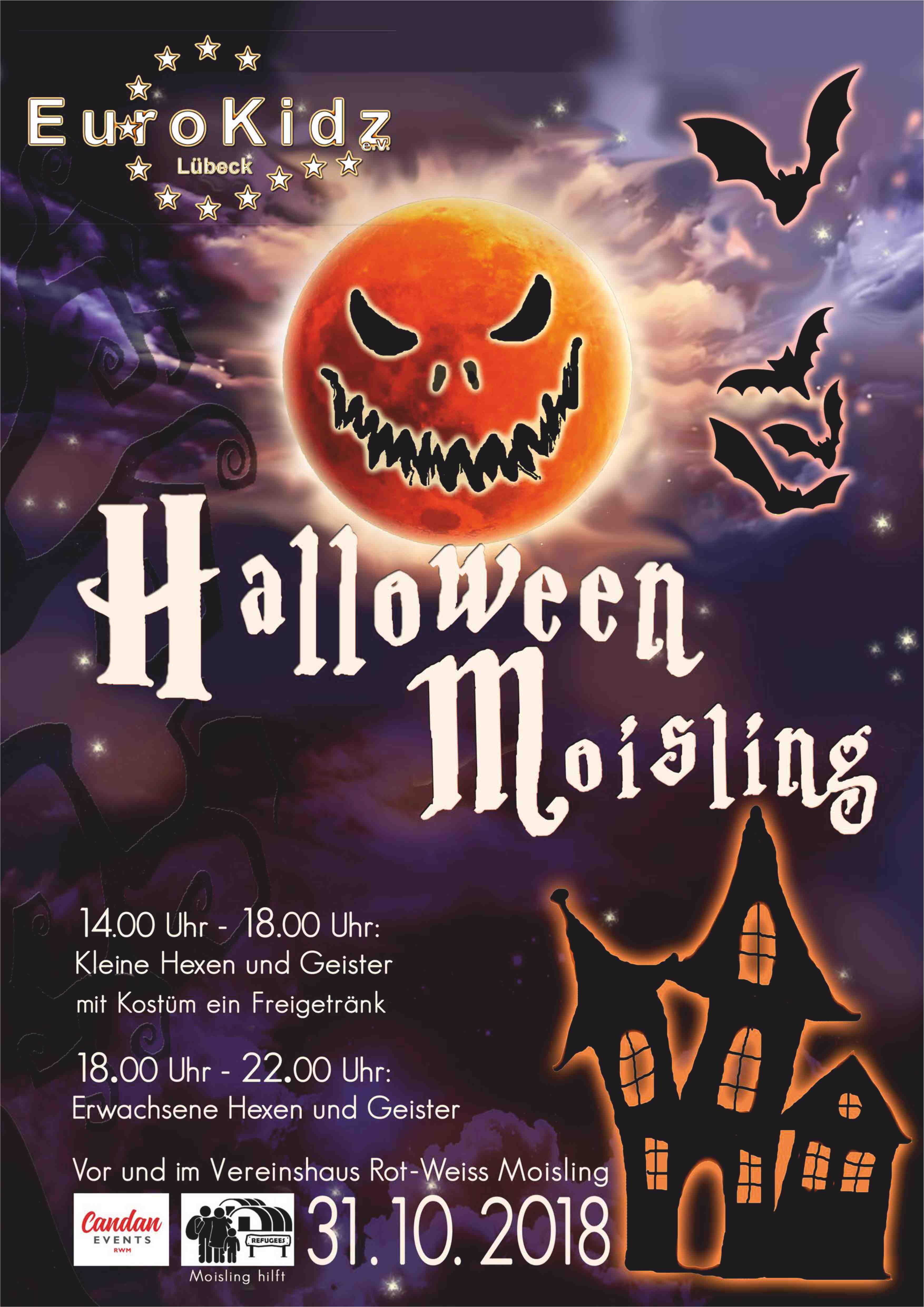 Die Euro Kidz haben einen cooles Halloween geplant. Am Nachmittag ab 14 Uhr können kleine und große Geister vor dem Vereinsheim Rot Weiß Moisling Spiele spielen und sogar einen Geisterjägerpaß machen. Natürlich gibt es Musik, Kaffe, Cay, Kuchen, Würstchen und Popcorn zu moderaten Preisen. Ab 14 Uhr ist auch das Vereinhaus geöffnet, damit die Geistereltern sich zurückziehen können und gemütlich zusammen sitzen. Wir schenken alkoholfreie Getränke und Bier aus.