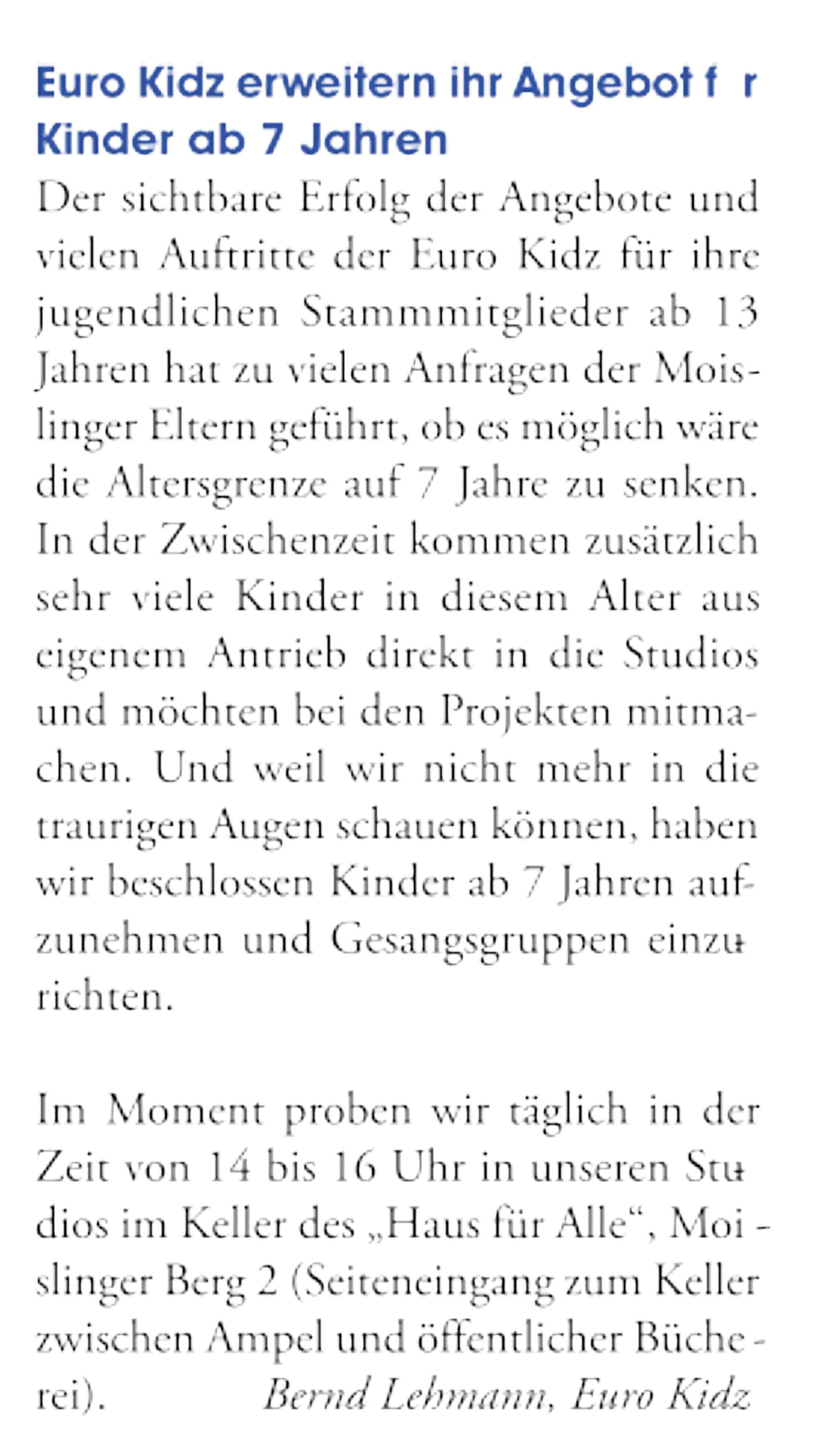 Hier ist ein Bericht aus der Quartalszeitschrift „Moisling aktuell“, Oktober 2018, über die von uns geplante neue Sängergruppe für Kinder ab 7 Jahren. Die Kinder werden im Kurs lernen ihre Stimme auszubauen, selbstsicher auf der Bühne zu stehen und ihr können öffentlich aufzuführen. Natürlich ist die Sängergruppe für Anfänger geeignet.