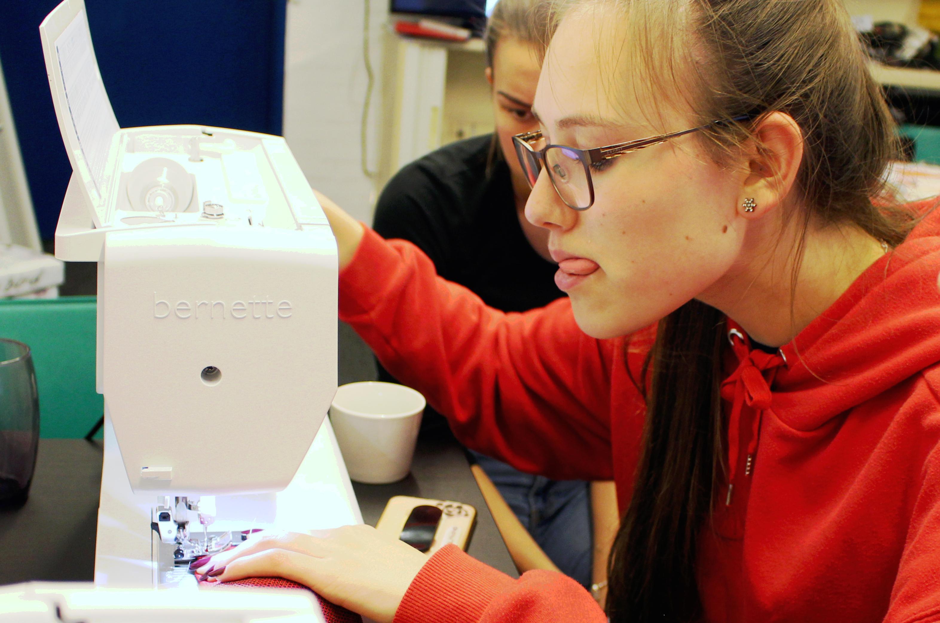 Janina erklärt und zeigt den Mädchen, wie die Maschine vorbereitet wird und wie man mit der Maschine näht.