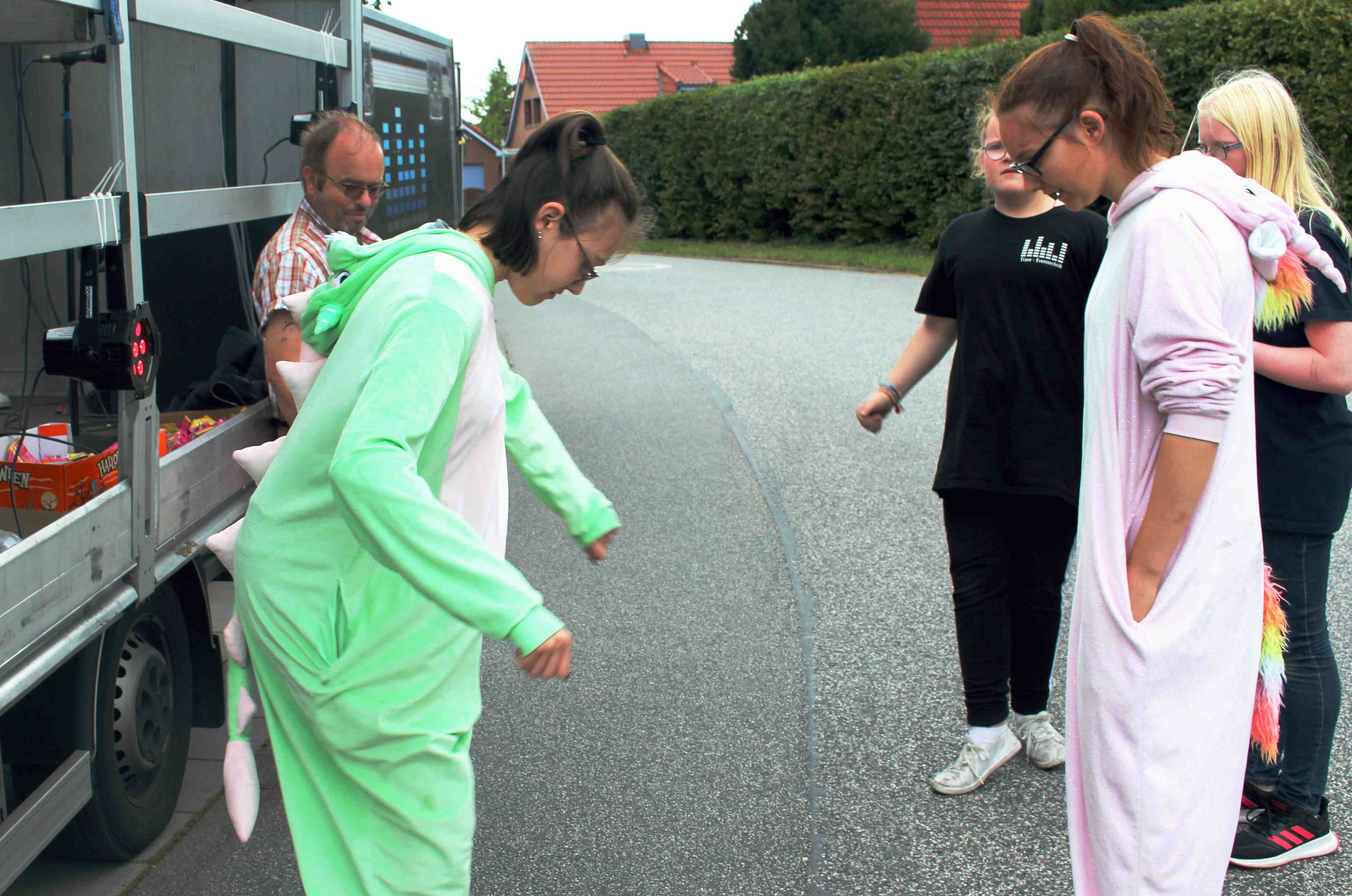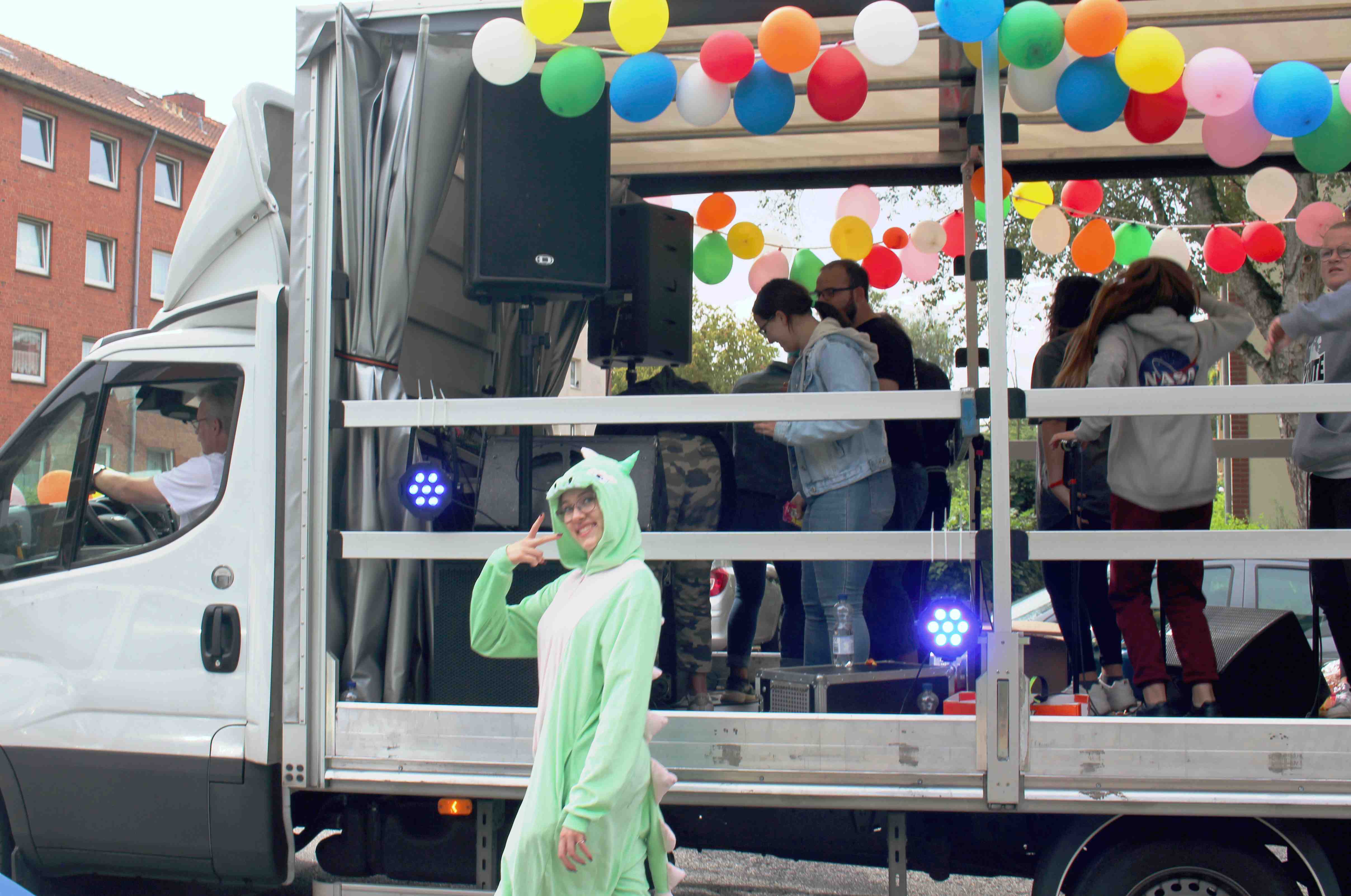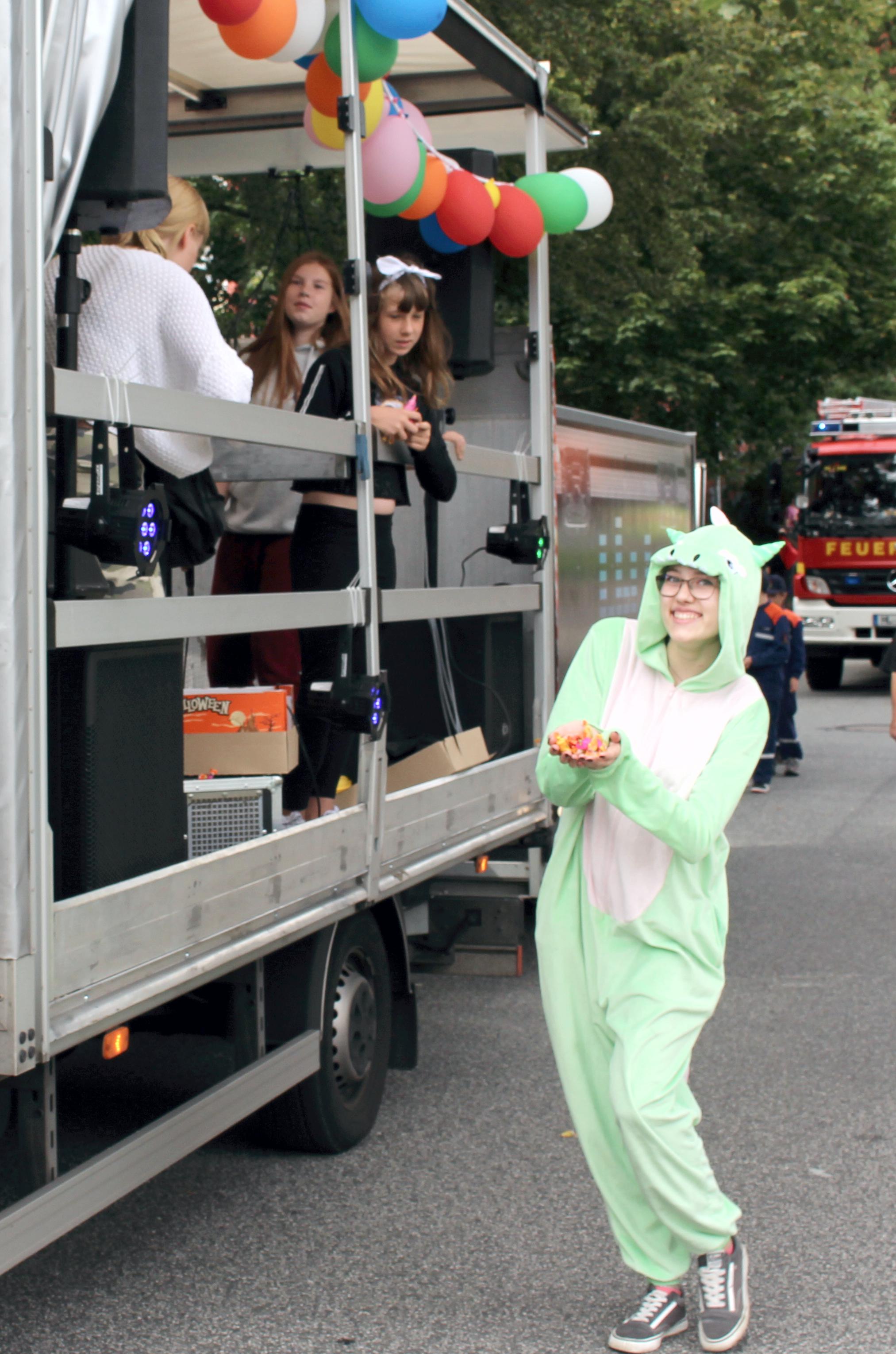 Neben und vor dem Wagen laufen ein Drache und ein Einhorn mit guter Laune, Security Markus und unsere Fotografin Kataryna. Die restlichen Mitglieder werfen rund 30 KG Bonbons in die Menge. Spontan haben sich uns noch mehr Moislinger Jugendliche angeschlossen.