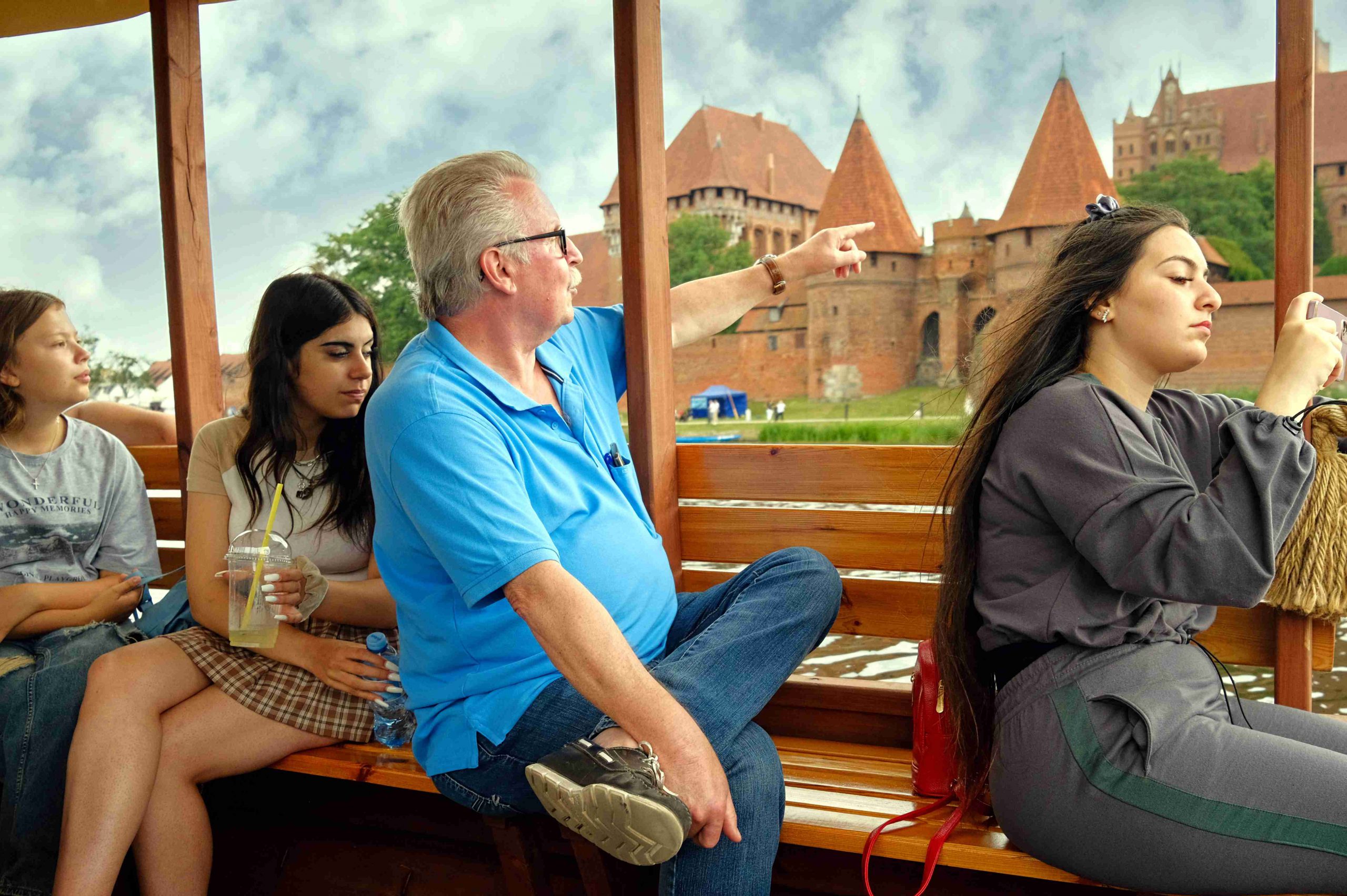 Gemütliche und interessante Schifffahrt auf dem Fluss Nogat. Im Hintergrund die weltgrößte Backsteinburg – die Marienburg.