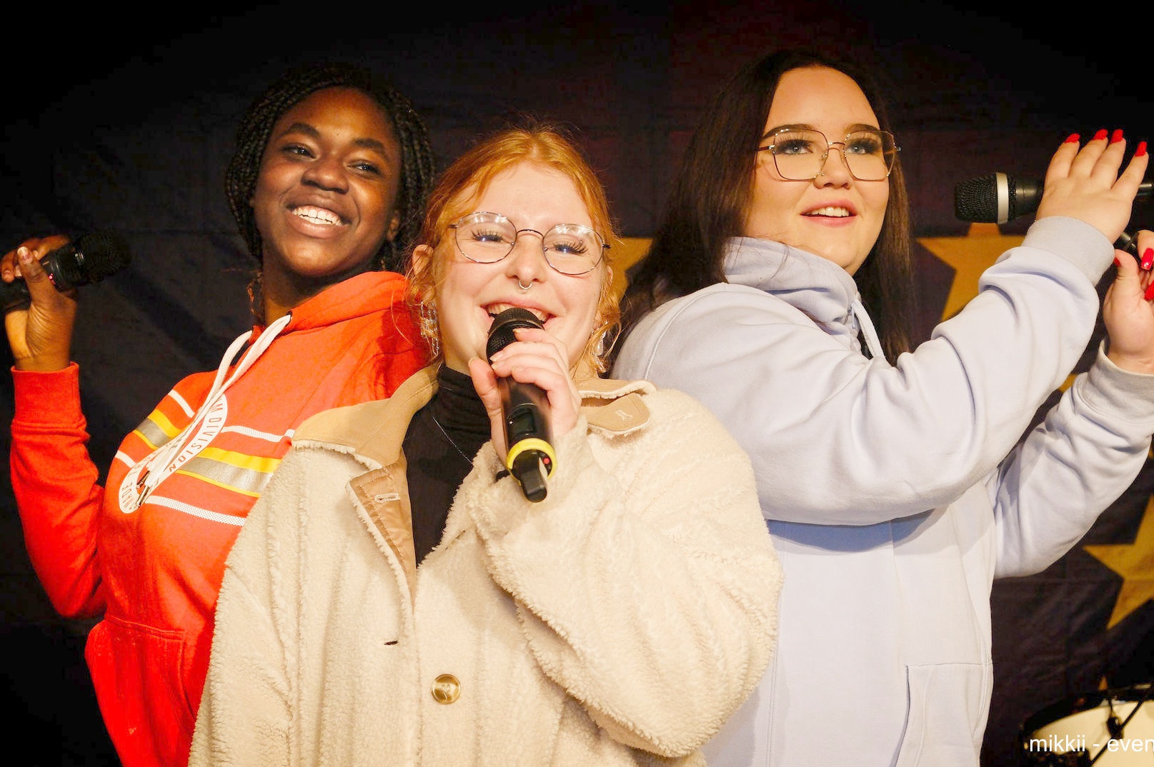 Unsere Showband-Sängerinnen: Iris, Finja und Sofia geben, wie immer alles um das Publikum mitzureißen. Den Spaß sieht man ihnen wohl an.