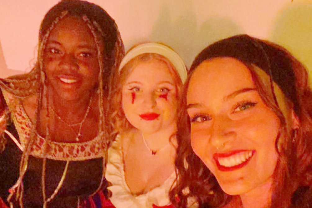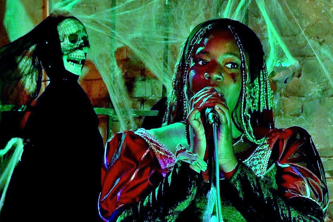 Aus Showbandsängerin Iris lässt sich von Gerippen und Monstern nicht beeindrucken und singt gemeinsam mit Leah und Finnja ihr neues Programm.