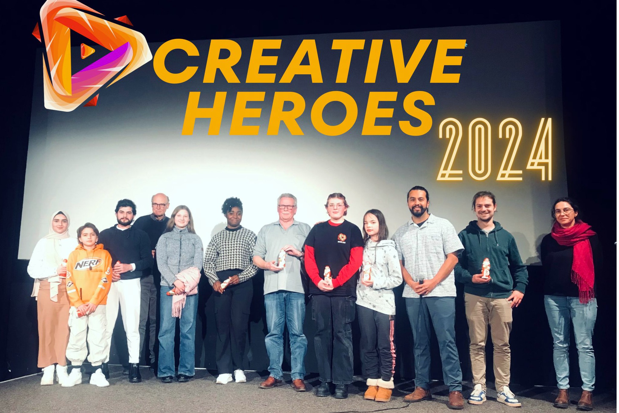 Die Teilnehmer der Workshops vor der Kinoleinwand haben original „Weihnachts-Oskar“ bekommen.