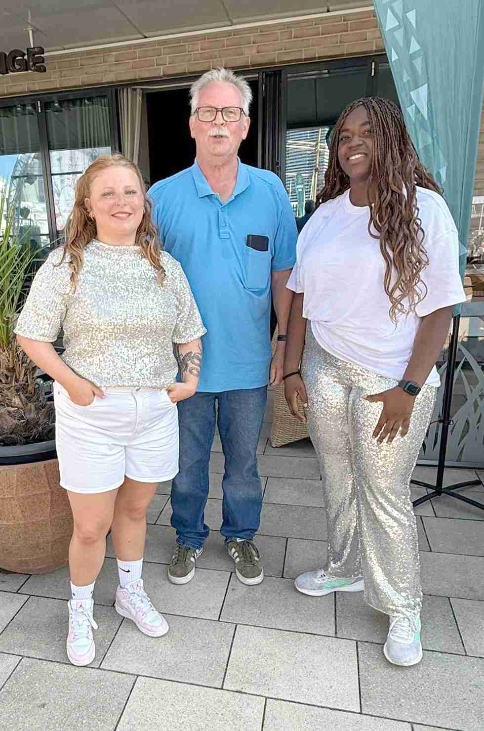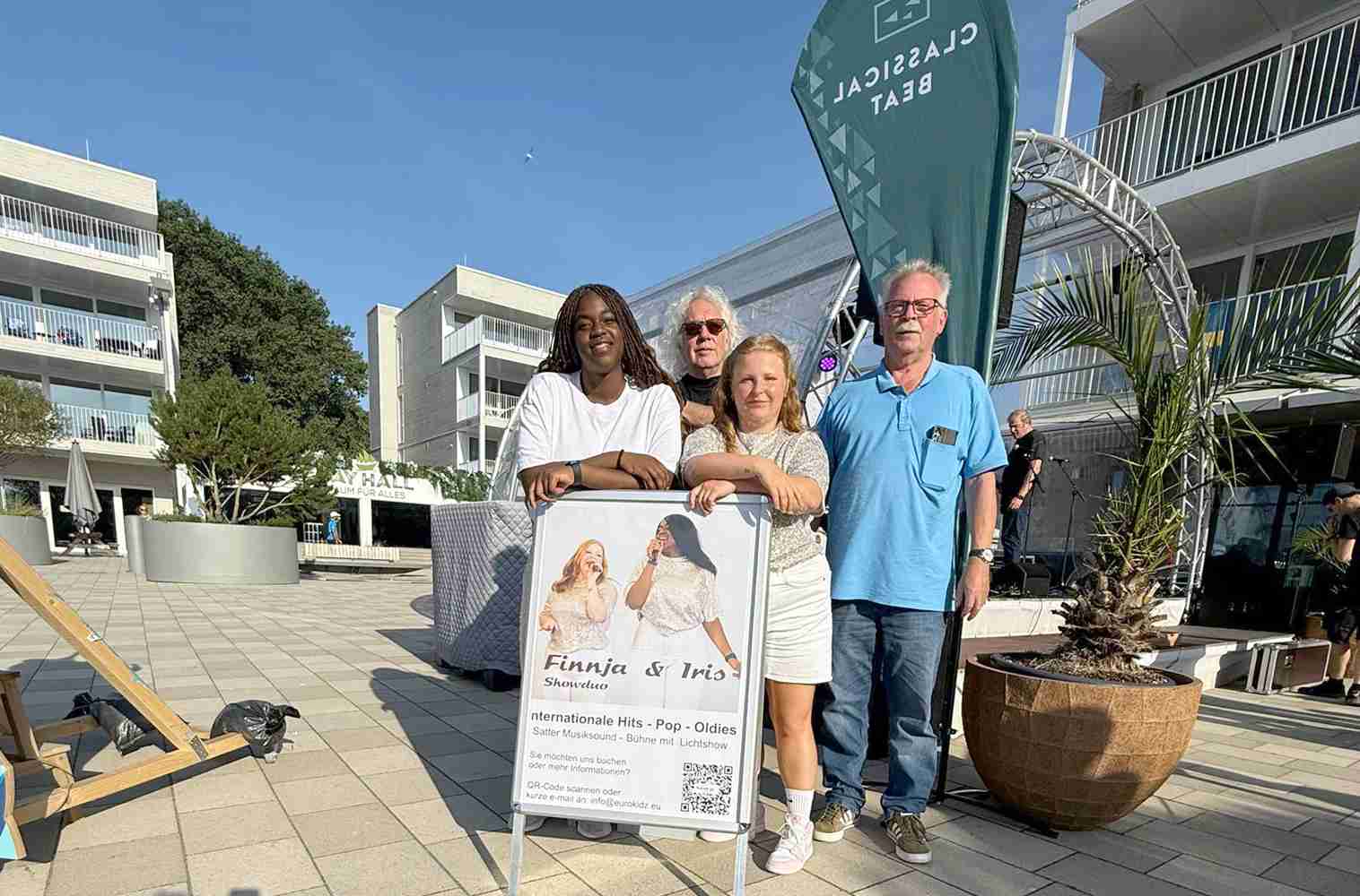 Mit dieser Truppe sind wir angetreten: Iris und Finnja – Gesang, Michael – Choreografie, Bernd – Gesangscoaching und Technik