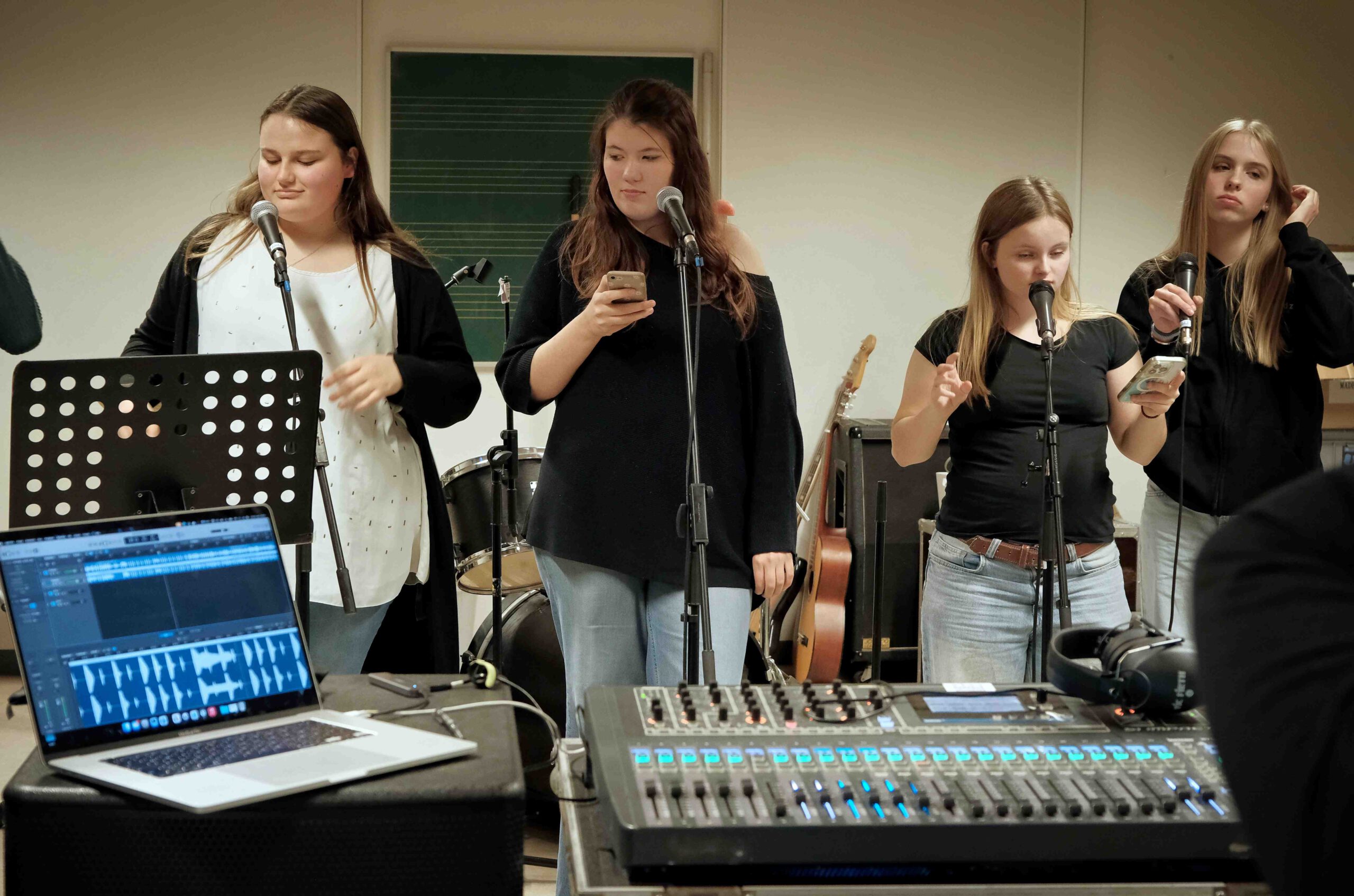 Singen vor allen Leuten ist auf einmal auch kein Problem mehr. Wir trainieren unsere Stimmen und bereiten uns auf die Gesangsaufnahmen vor. Und bei der aufwändigen Technik klappt es auch.