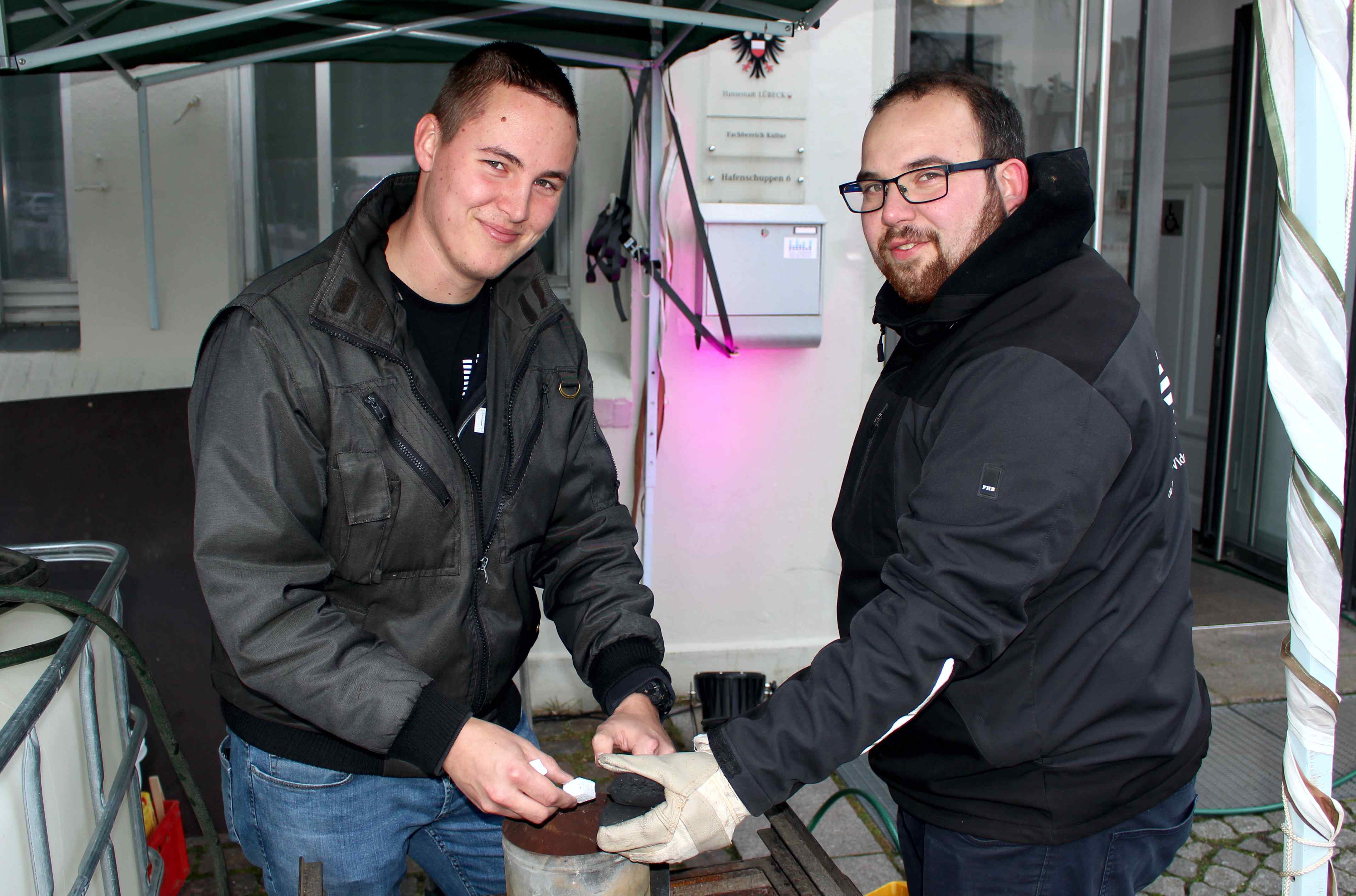 In der Zwischenzeit haben wir draußen den Wurtsgrill und den Glühweinstand aufgebaut. Feuer frei.
